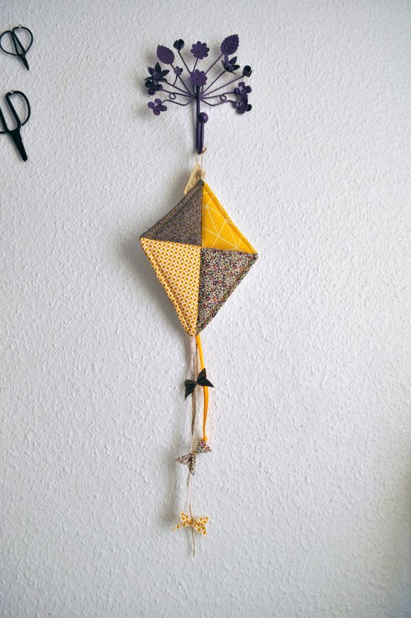 Cerf-volant décoratif fabriqué avec des jolies chutes de tissus.